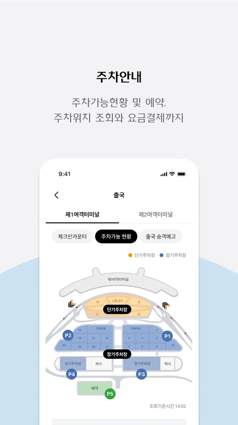 - “인천공항 주차내비” 앱 또는 “인천공항+” 앱에서 주차 공간 실시간 조회 가능: